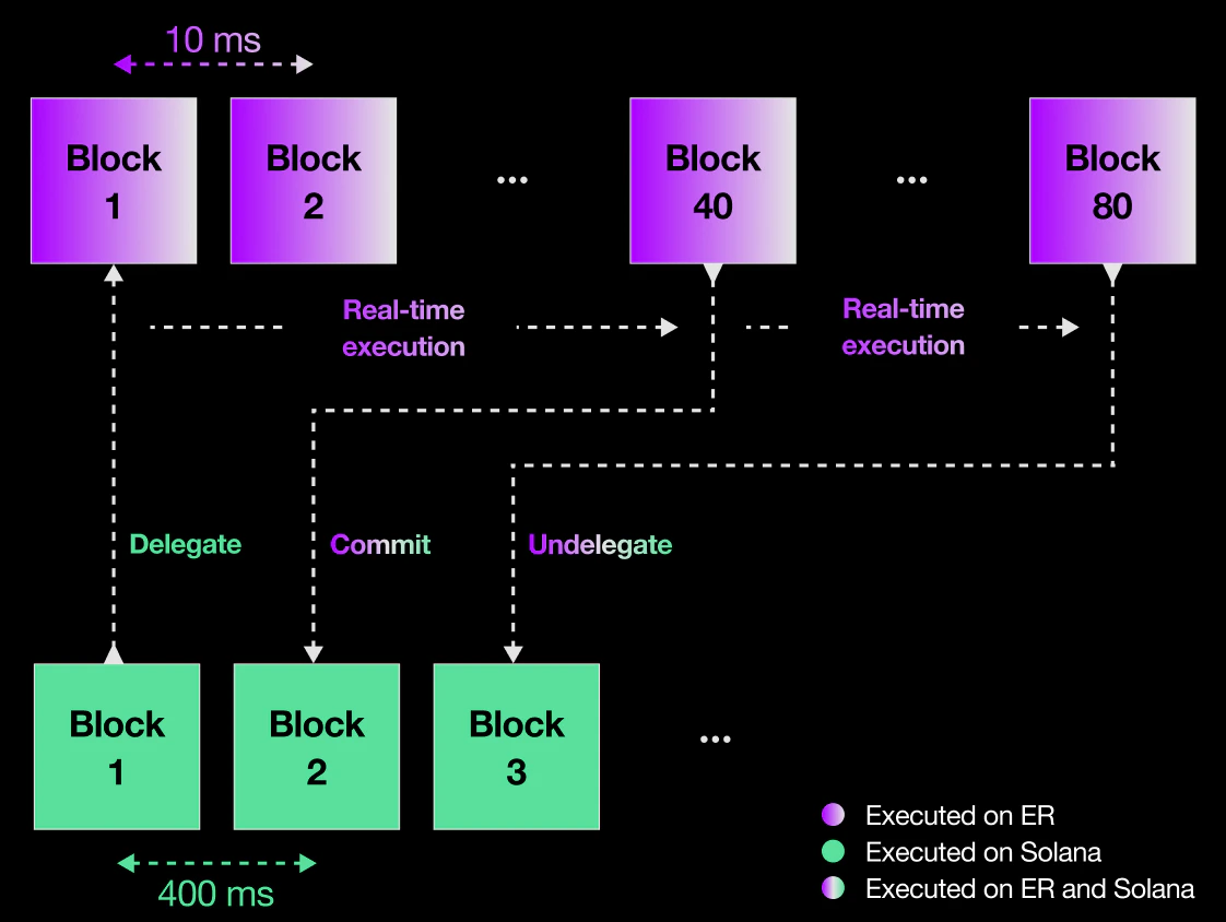 **Делегированные аккаунты состояния обновляются в реальном времени с помощью транзакций на ЭР напрямую или через **Magic Router. Начальная транзакция на ЭР клонирует делегированный аккаунт с базового слоя в эфемерный роллап.