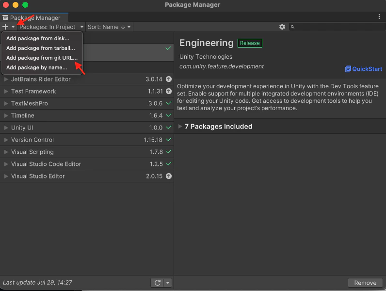 - Выберите Unity Package Manager в меню добавления. Появятся текстовое поле и кнопка Add.